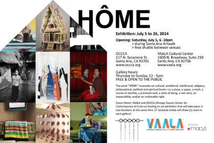 At the end of The Wizard of Oz, the Good Witch of the North tells Dorothy that she can return home by clicking her heels together and repeating “There’s no place like home. There’s no place like home. There’s no place like home.” Even a cursory look at the work in this OCCA / VAALA collaborative exhibition Home tells us emphatically that there is indeed no longer a place like home, at least not the home to which Dorothy and Toto return at the end of the film. If there is any vestige of a connection between today’s home and the home depicted in the 1939 film, it is the home seen at the beginning of the film rather than the end, the home that is swept up into the clouds by a twister, the unstable, topsy-turvy structure that has been ripped from its foundations and hurled skyward. Dorothy’s floating bed, the whirling images and nightmare dizziness transform the familiar into the frightening which is the case with many of the pieces in this exhibition. The home, as depicted in this exhibition is a site occupied, for the most part, by dysfunctional families and disoriented people.